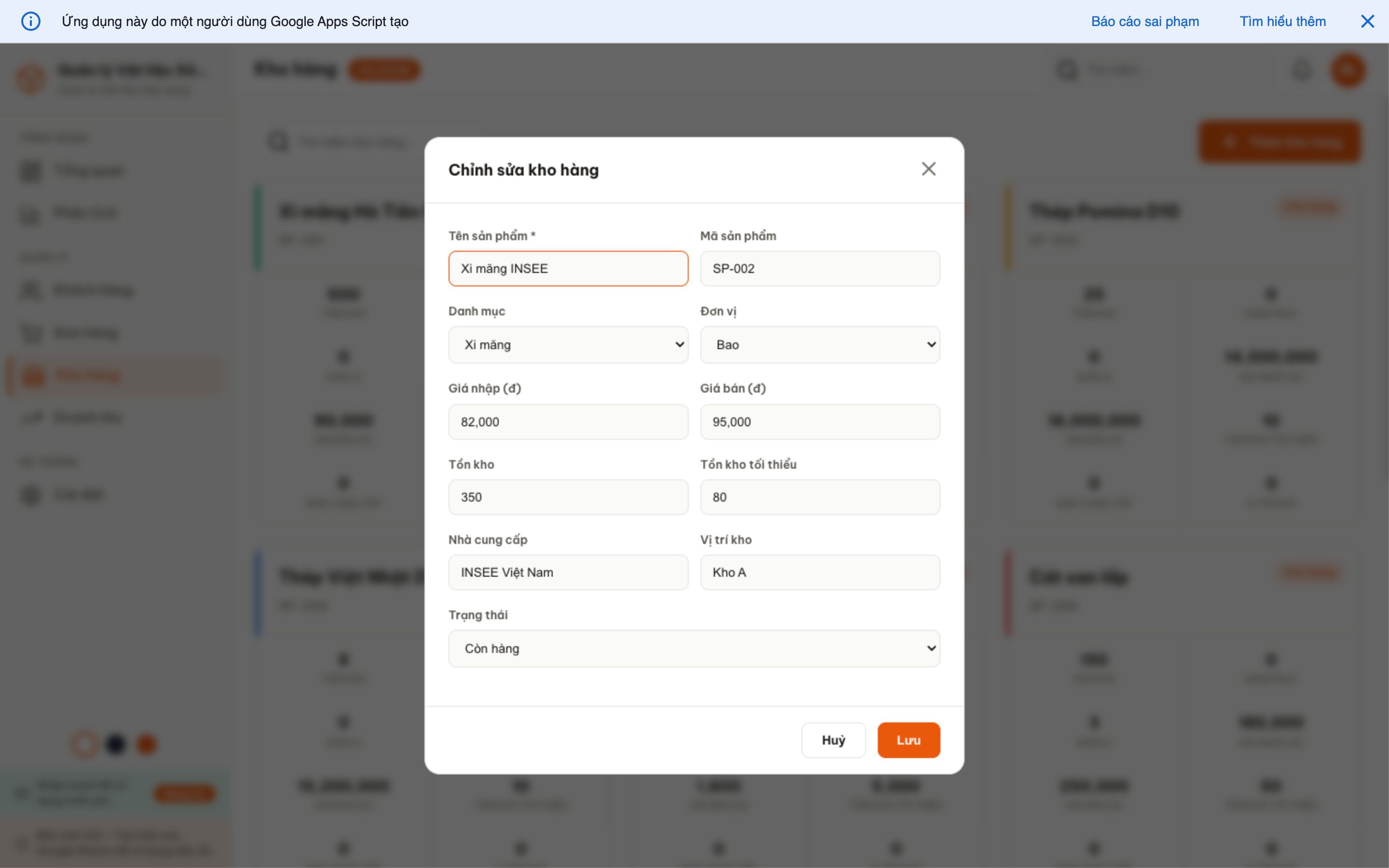 Quản lý cửa hàng vật liệu xây dựng trên Google Sheets