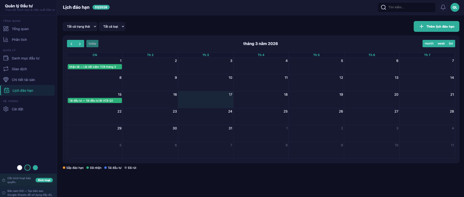 Calendar đáo hạn trái phiếu, tiết kiệm, cổ tức, lãi suất.