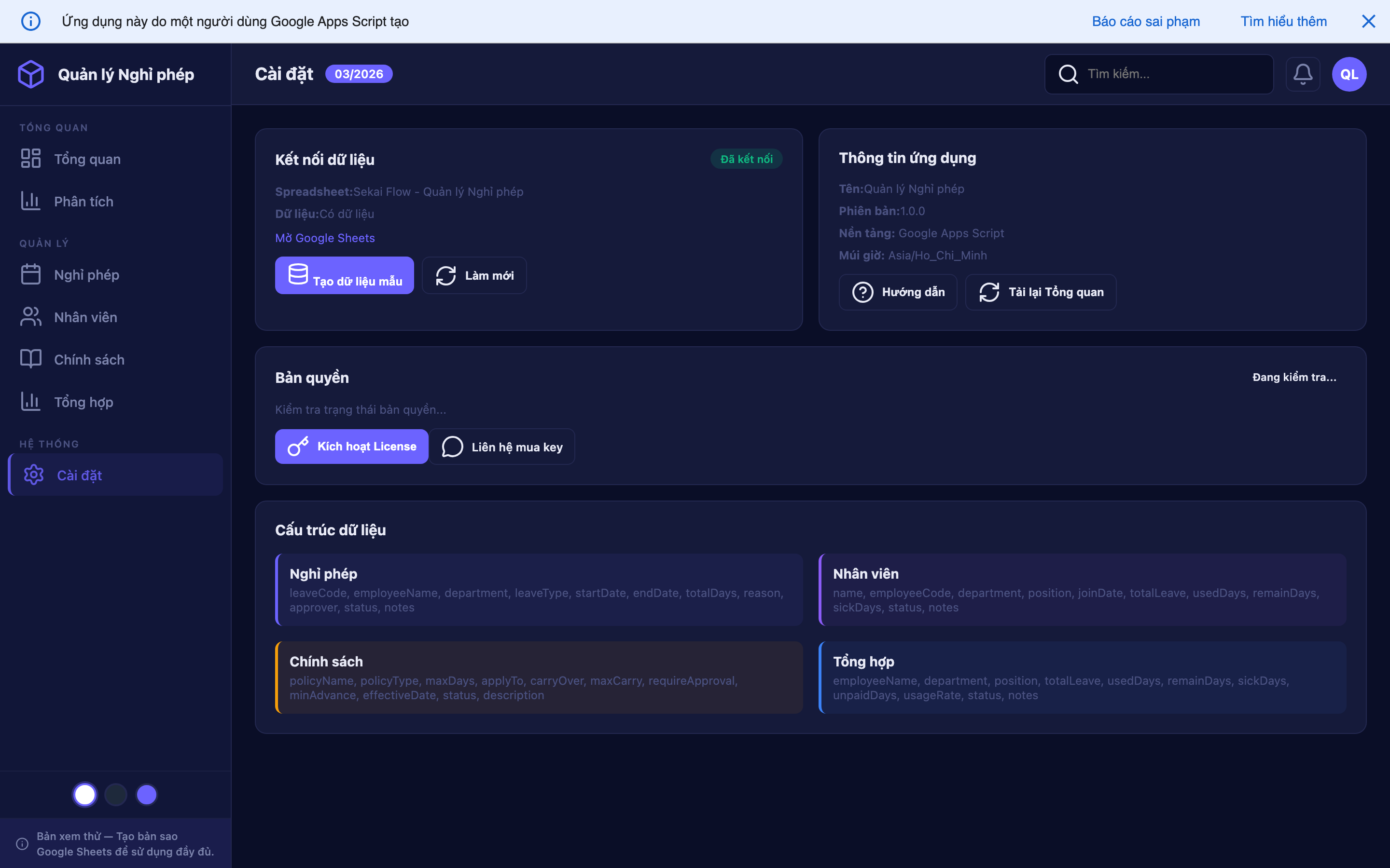 Hệ thống quản lý nghỉ phép, chính sách và tổng hợp phép năm trên Google Sheets