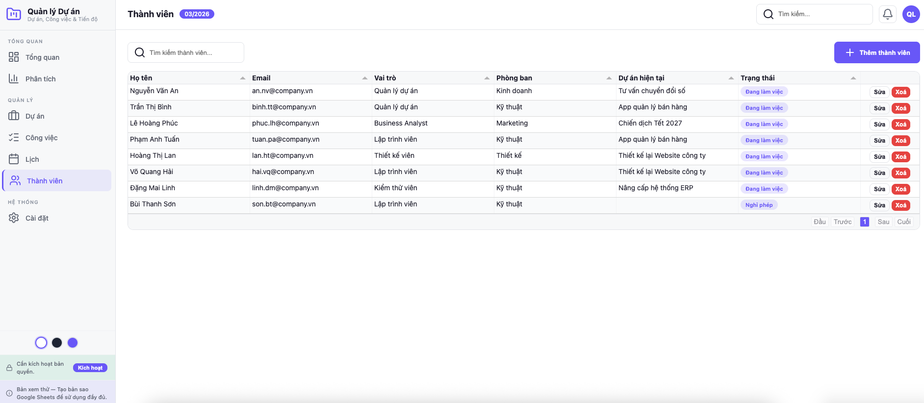 Bảng thành viên: vai trò, phòng ban, kỹ năng, dự án hiện tại. Dashboard phân tích team.