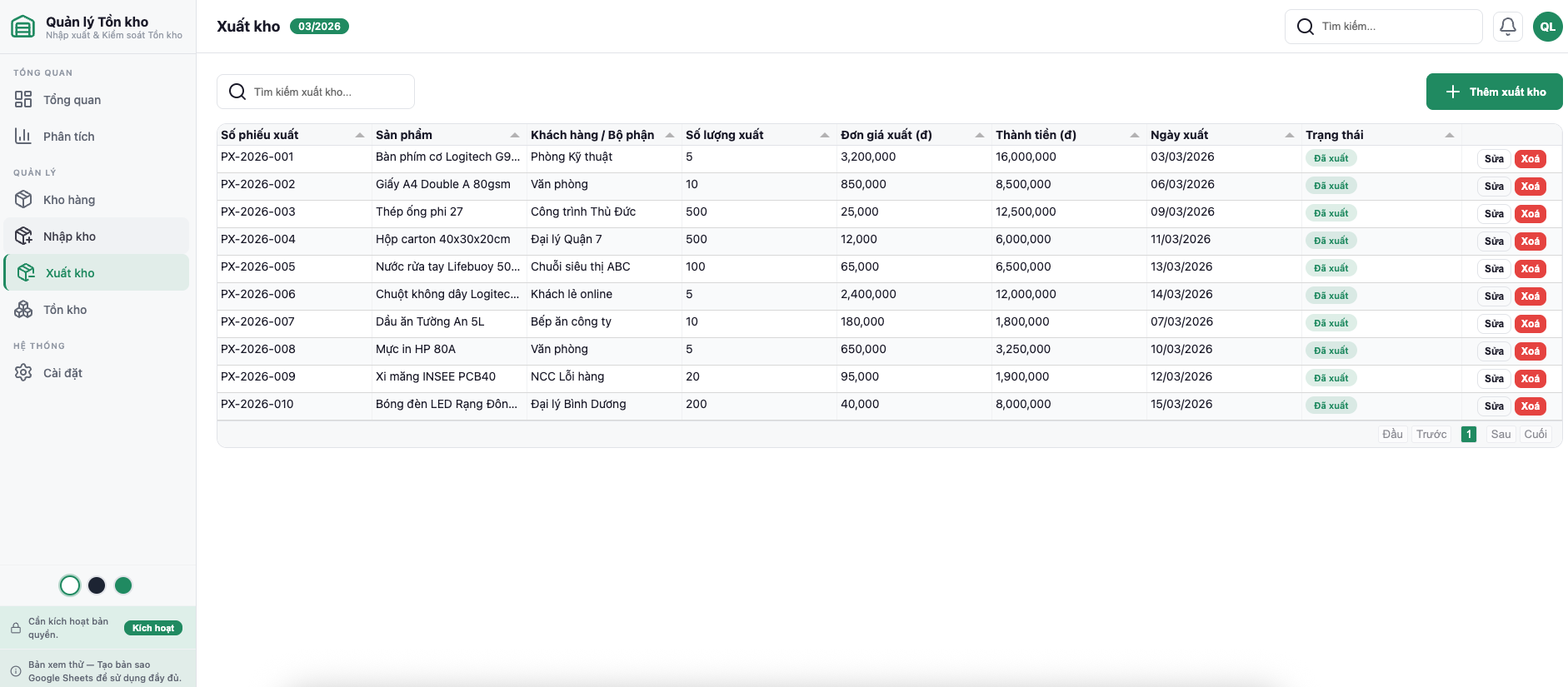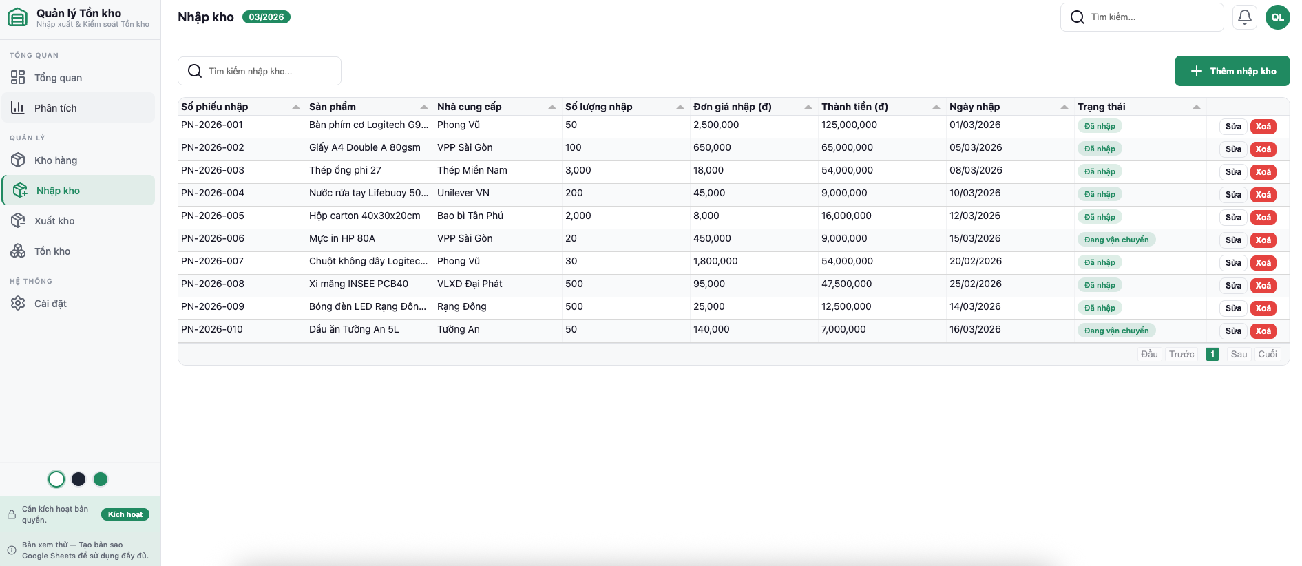 Nhập xuất & Kiểm soát tồn kho trên Google Sheets