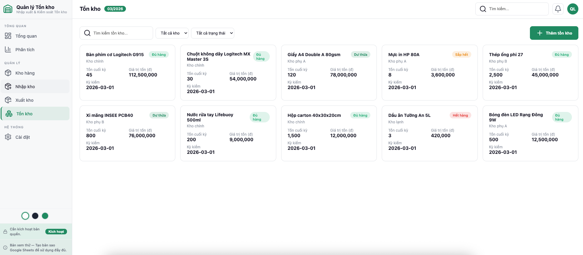Ứng dụng quản lý tồn kho toàn diện chạy trên Google Sheets. Quản lý sản phẩm với ảnh, theo dõi nhập kho - xuất kho, kiểm soát tồn kho theo kỳ. Dashboard cảnh báo hết hàng, phân tích nhà cung cấp, lý do xuất kho. Giao diện Sage Green sáng, hiện đại.