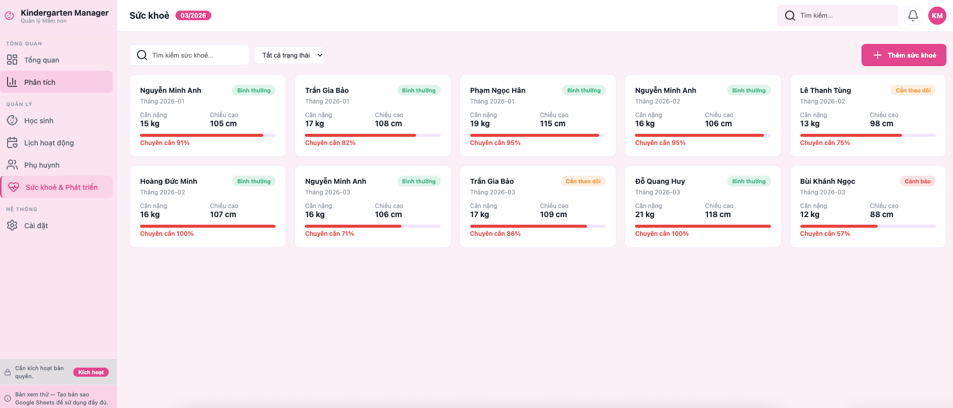 Theo dõi cân nặng, chiều cao, chuyên cần, nhận xét phát triển theo tháng.