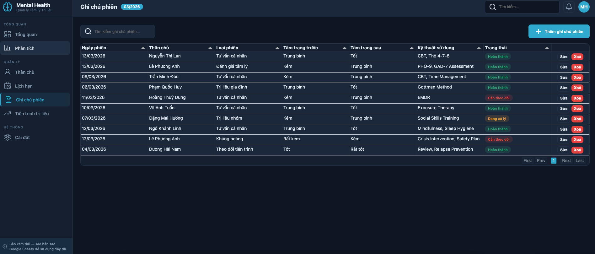 Ứng dụng quản lý tâm lý trị liệu chạy trên Google Sheets. Quản lý thân chủ, lịch hẹn, ghi chú phiên trị liệu, theo dõi tiến trình (GAD-7, PHQ-9, điểm hạnh phúc). Dashboard phân tích toàn diện. Giao diện Ocean Night dark theme chuyên nghiệp.