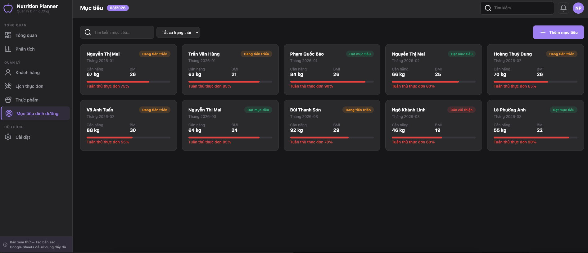 Lập kế hoạch dinh dưỡng chuyên nghiệp trên Google Sheets