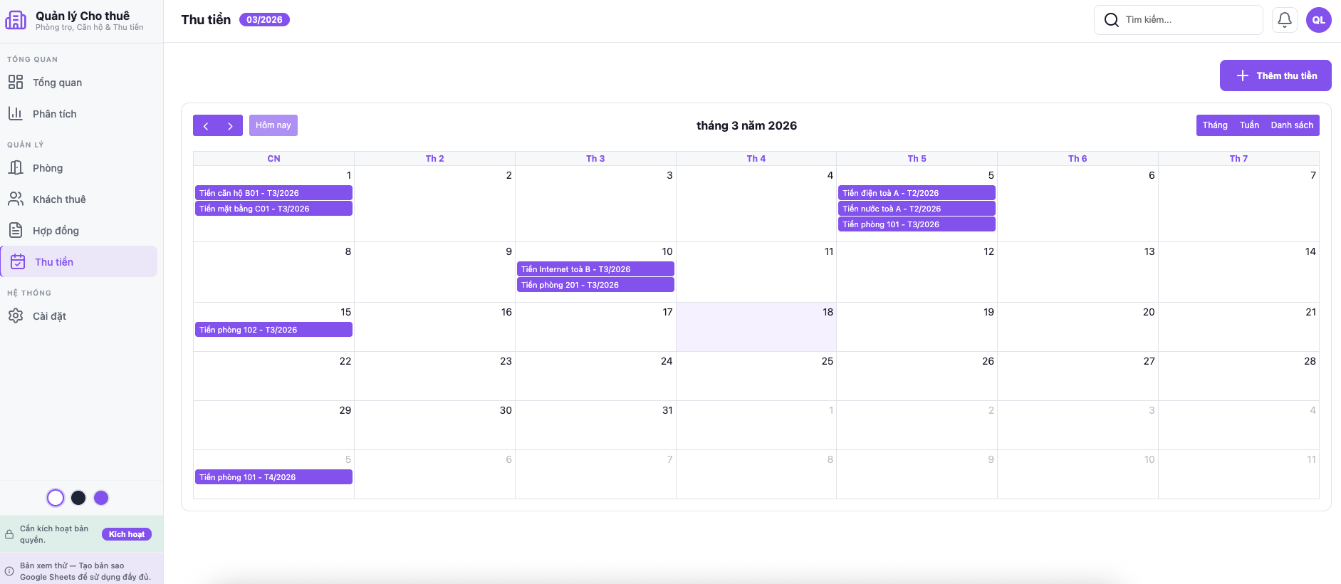 Calendar trực quan: tiền phòng, điện, nước, internet. Mã màu theo trạng thái đã thu/chưa thu/quá hạn.